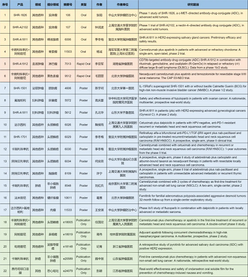 在肺癌、妇科肿瘤、淋巴瘤、膀胱癌、头颈肿瘤、黑色素瘤、肉瘤、鼻咽癌、脊索瘤、唾液腺癌、胸腺癌、硬纤维瘤、涎腺导管癌等其他多个疾病领域,卡瑞利珠单抗、阿帕替尼、阿得贝利单抗、吡咯替尼、达尔西利、氟唑帕利、法米替尼、SHR-1501、瑞拉芙普-α(SHR-1701)、SHR-1826、瑞康曲妥珠单抗(SHR-A1811)、SHR-A1912、SHR-A2102等抗肿瘤创新药相关研究一共入选了4项口头报告、2项快速口头报告、11项壁报展示和4项线上发表,彰显了z6尊龙官方网站医药强劲的研发实力。此外,昂丹司琼口溶膜在防治化疗导致的恶心呕吐方面展现出了良好的疗效,本次ASCO年会有1项研究线上发表。